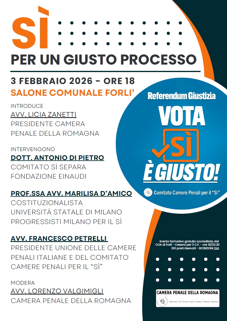 la Camera Penale della Romagna ha organizzato un evento pubblico di approfondimento sul tema della riforma sulla separazione delle carriere che si terrà il prossimo martedì 3 febbraio ore 18 presso il Salone Comunale di Forlì, con lo scopo di offrire un dibattito tecnico - giuridico e culturale su un tema che rappresenta, da oltre trent'anni, un obiettivo fondamentale delle Camere Penali Italiane per la completa attuazione del giusto processo.
