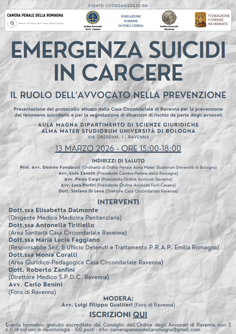 Vi invitiamo a partecipare all'incontro – co-organizzato da Camera Penale della Romagna, Consiglio dell'Ordine degli Avvocati di Ravenna e Consiglio dell'Ordine degli Avvocati di Forlì–Cesena – che si terrà il giorno 13 marzo 2026, orario 15–18 in presenza presso l'Aula Magna del dipartimento di Scienze Giuridiche via Oberdan, 1 – Ravenna dal titolo "EMERGENZA SUICIDI IN CARCERE - IL RUOLO DELL'AVVOCATO NELLA PREVENZIONE".